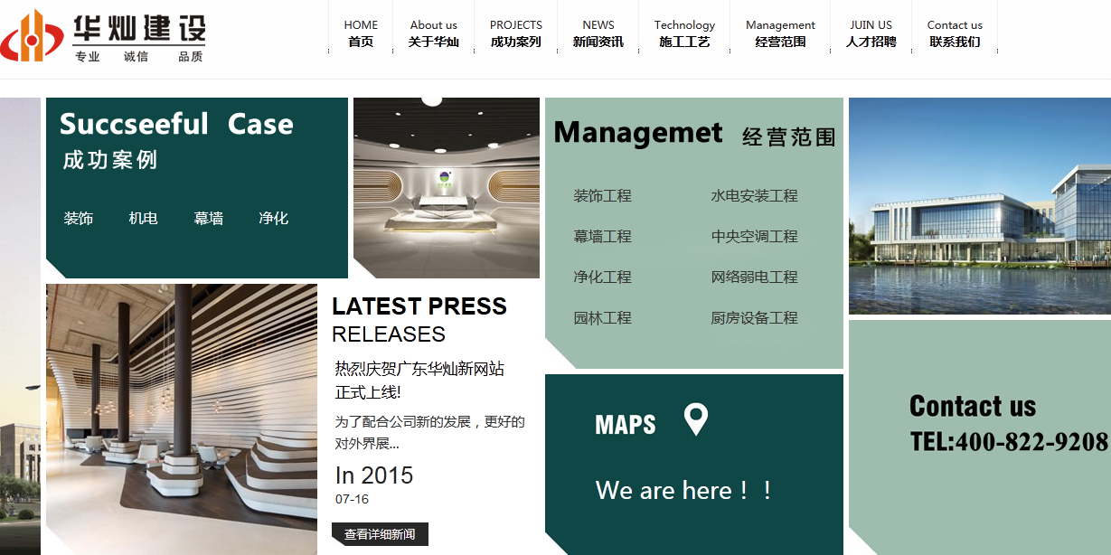 華燦建設(shè)在珠三角承接各類工程,合同履約率達(dá)100%,優(yōu)質(zhì)工程率達(dá)90%以上。50多人的技術(shù)骨干隊(duì)伍,10多人的二級(jí)注冊(cè)建造師、造價(jià)工程師、高級(jí)工程師、設(shè)計(jì)師、工藝美術(shù)師等專業(yè)隊(duì)伍。