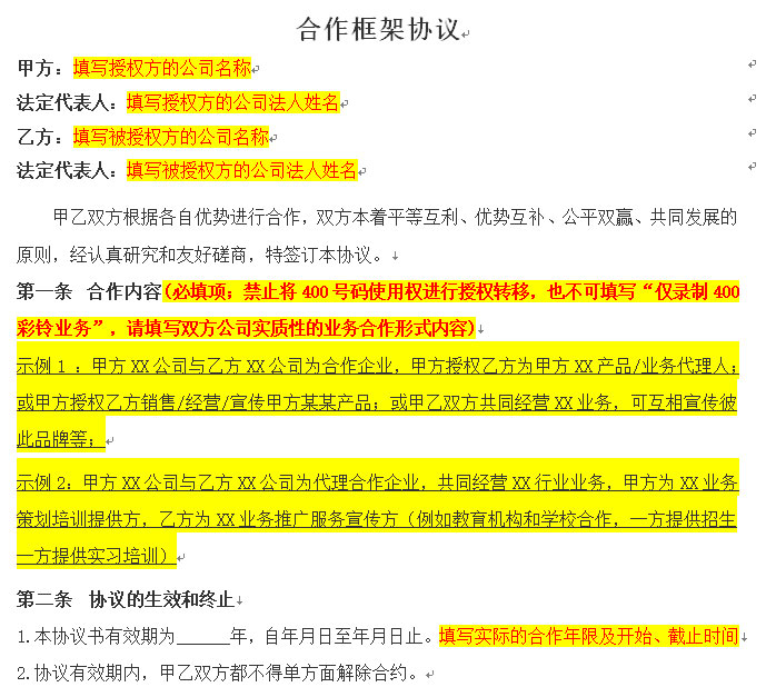 ![]() 第一條 合作內(nèi)容(必填項;禁止將400號碼使用權(quán)進(jìn)行授權(quán)轉(zhuǎn)移,也不可填寫“僅錄制400彩鈴業(yè)務(wù)”,請?zhí)顚戨p方公司實質(zhì)性的業(yè)務(wù)合作形式內(nèi)容)